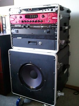 Gator case. I purchased a relatively inexpensive 12" Emenence speaker and trimmed a piece of MDF to fit my 10U Gator case. Using the circle cutout