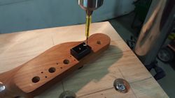 mounted in my drill press. I carefully maneuvered the body through the entire neck-pocket area making sure I didn't chip the finish around the edges, etc.