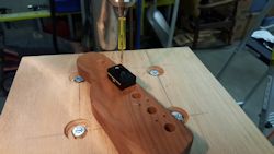 After drilling the alignment holes for the locking tuners (using Stewart-MacDonald's cool self-aligning tool), I installed the tuners, bolted the neck
