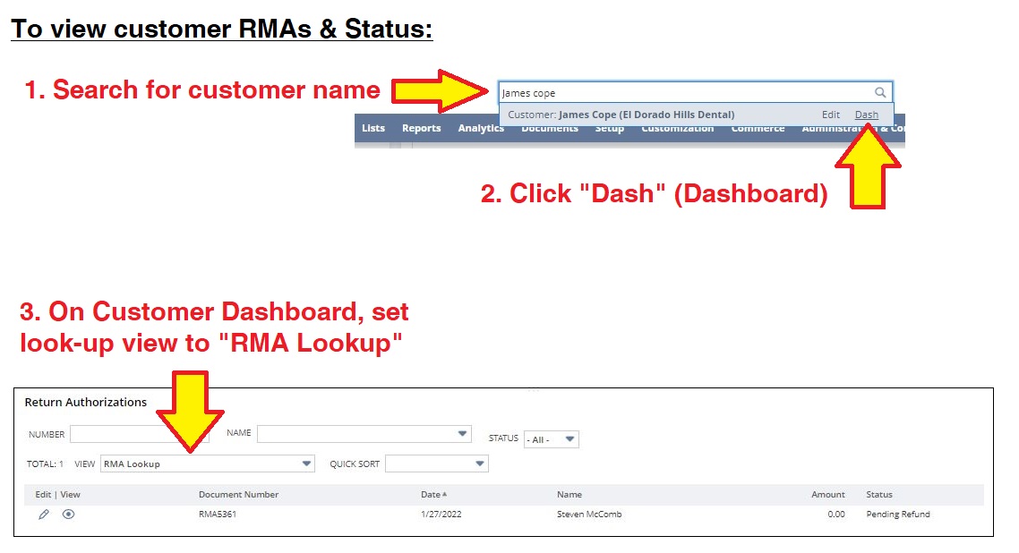 Here's another quick way to view a customer's RMA status (note: in NetSpeak, "Pending Refund", etc. can also mean the item is in "Under Repair" status).